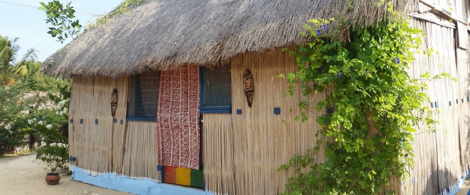 The family room – even called the Mask Hut – can contain 4 people. There are two double bamboo beds with mosquito nets. It’s furnished with a table, fan, a bamboo cabinet, local mats and a bamboo armchair. Outside and inside the hut, you can admire some traditional Ghanaian masks.