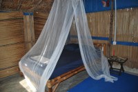 The family room – even called the Mask Hut – can contain 4 people. There are two double bamboo beds with mosquito nets. It’s furnished with a table, fan, a bamboo cabinet, local mats and a bamboo armchair. Outside and inside the hut, you can admire some traditional Ghanaian masks.
